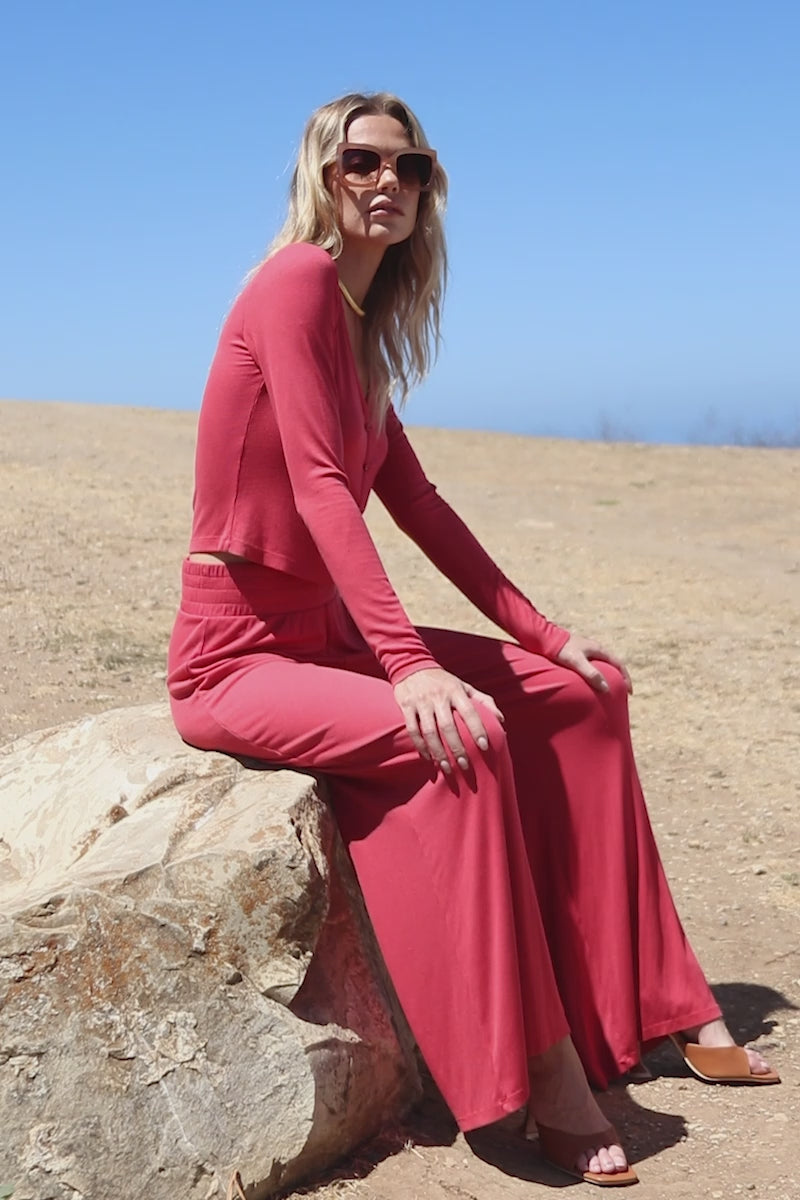 Why choose between a cardigan and a top when you can have the stylish versatility of both? This sustainably made mini cardi can be worn buttoned up as a top with the Sutton Wide Leg Silky Pant.
