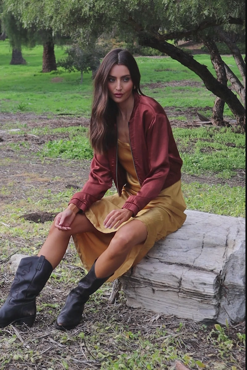 Our new bomber jacket exudes the eighties vibes while adding a modern twist. Made in a silky fabric with contrasting details, it’s a must-have for anyone craving a dose of nostalgic style. Pairs perfectly with the Clement Crop V Tank, Agnes Silky Cargo Long Pant and the Maureen Silky Volume Skirt.